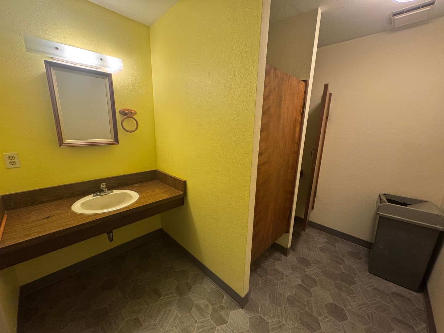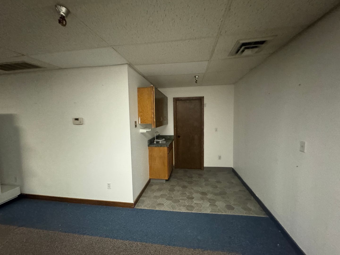 Access is through the common mall area, leading down the hallway to the main suite. The layout includes two separate office spaces, a spacious main area, and a private restroom with two toilet stalls.